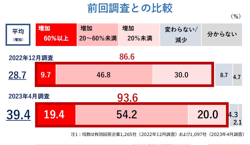 2022年12月に実施した前回調査と比べると、【増加】した企業を合わせた割合は7.0ポイント増加(前回調査86.6%⇒今回調査93.6%)。20%以上増加した企業の割合が高まっており、料金変化率の平均は10.7ポイント上昇(同28.7%増⇒同39.4%増)。