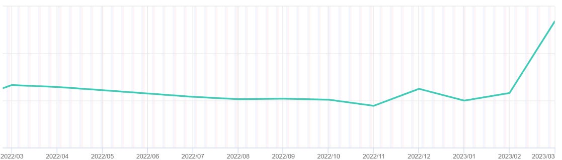 はじめに、2022年3月から2023年3月の「ヘルメット」の検索推移を調べたところ、2023年2月から「ヘルメット」の検索ボリュームが急増していることが分かりました。4月1日の改正道路交通法施行を前に、ヘルメット着用への関心が高くなったことの影響だと考えられます。