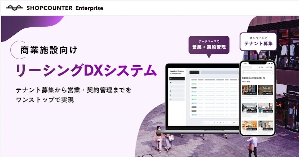 「SHOPCOUNTER Enterprise(ショップカウンター エンタープライズ)」とは、商業施設のオンラインリーシング・クラウド管理システムです。商業施設が自社スペースを掲載する「テナント募集サイト」と、問い合わせ・営業・テナント情報管理やスペースの稼働管理ができる「営業管理システム」を、開発なしで構築・利用でき、テナント募集業務の効率を上げることが可能です。