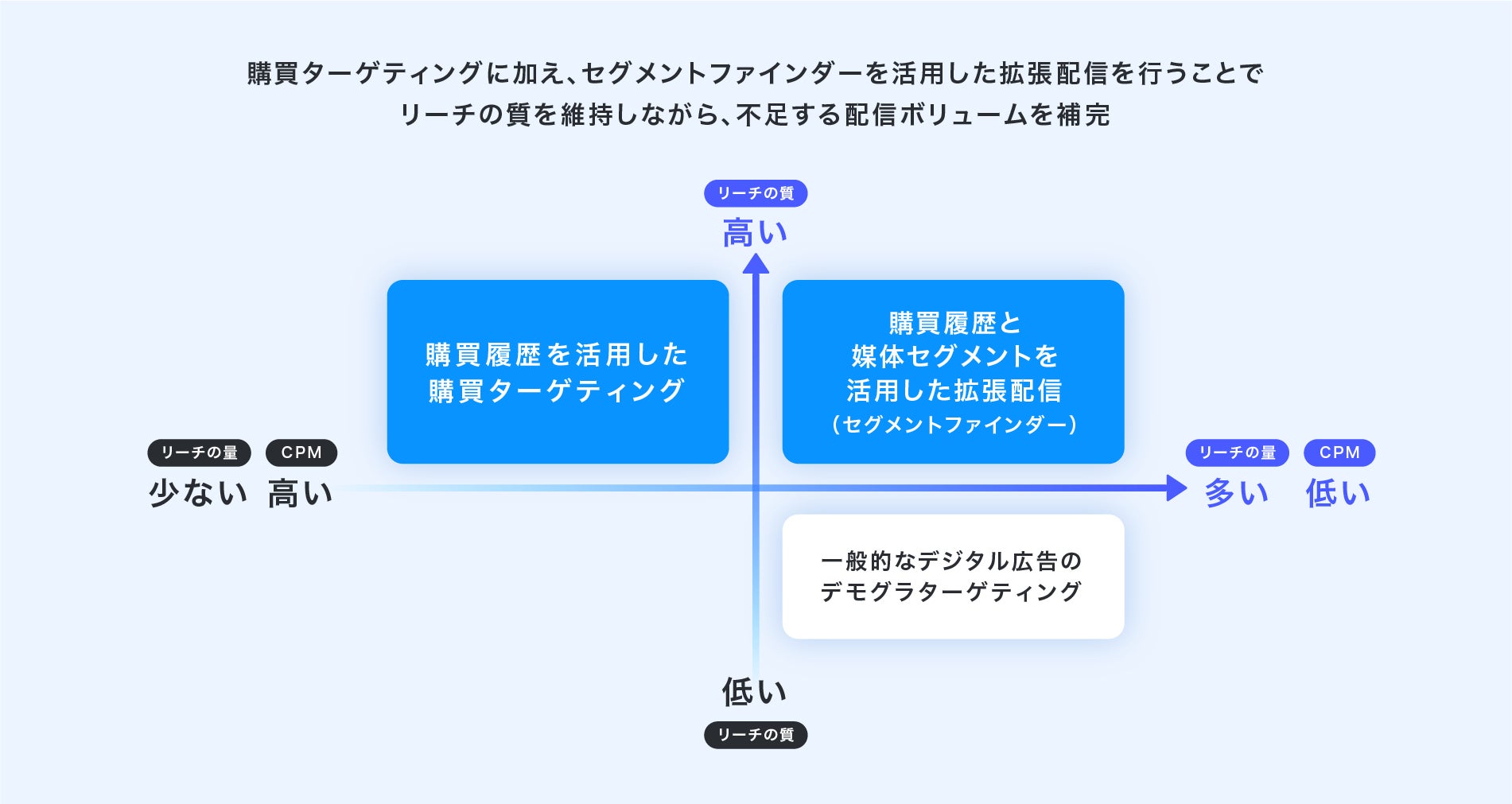 『セグメントファインダー』は、デジタル広告の配信先媒体が持つユーザー属性の中から、分析した購買指標をもとに、購買親和性の高いユーザー群を自動選定できる機能です。これにより、プランニングの段階で見込み顧客を選定でき、リーチの質と量を同時に追求した広告配信が可能となります。