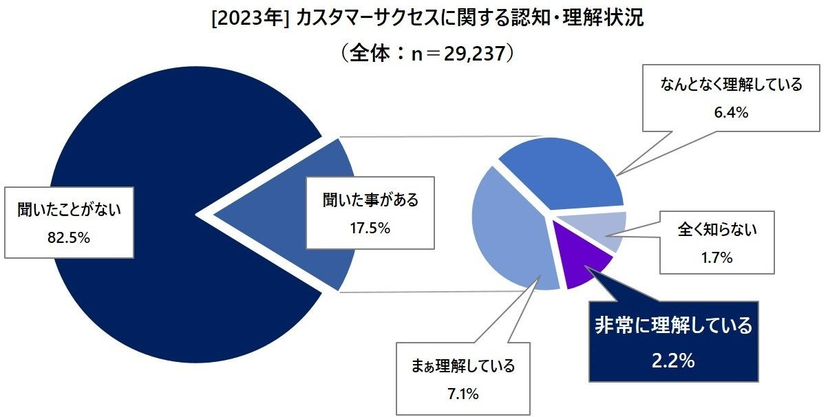 全国の20歳から65歳までの有職者29,237人を対象に、「カスタマーサクセスという言葉を聞いたことがありますか?」と尋ねたところ、「聞いたことがある」人は全体の17.5%、「聞いたことがない」と回答した人は5年連続8割を上回る結果となりました。また「聞いた事がある」人の中で、カスタマーサクセスとは何かを理解している人の割合は、今回の対象者全体のわずか2.2%で、過去5年で最も低い理解率という結果となりました。