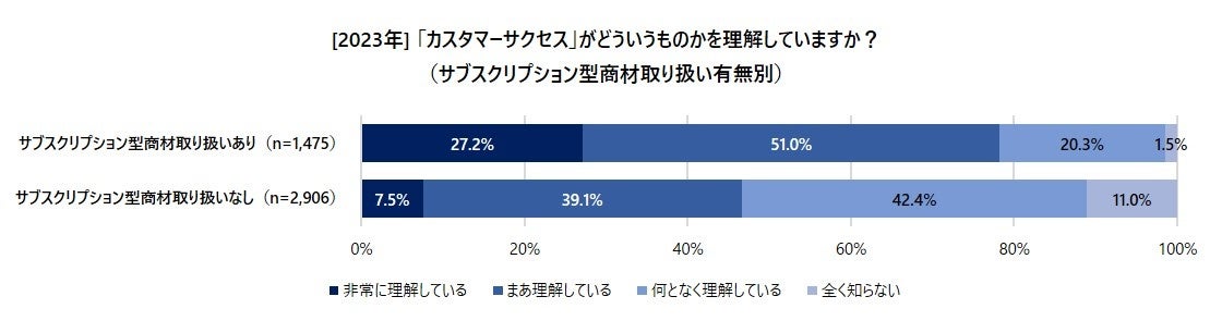 しかしその中から「理解度」を見てみると、サブスクリプション型商材の取り扱いがある人の中でカスタマーサクセスという言葉を知っていても、「非常に理解している」と答えた人はわずか3割弱であるという結果となりました。