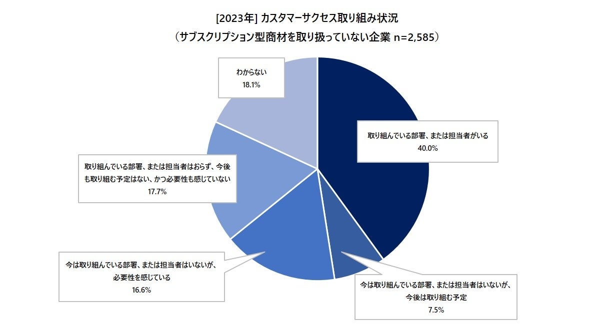 サブスクリプション型の商材を扱っていない企業においても40.0%の人がカスタマーサクセスの取り組みを行っていると回答、「今後取り組む予定」の人は7.5%、「必要性を感じている」16.6%と、サブスクリプション型商材を扱っていなくとも、半数以上の企業においてカスタマーサクセスが重要であると捉えているということがよくわかる結果となりました。