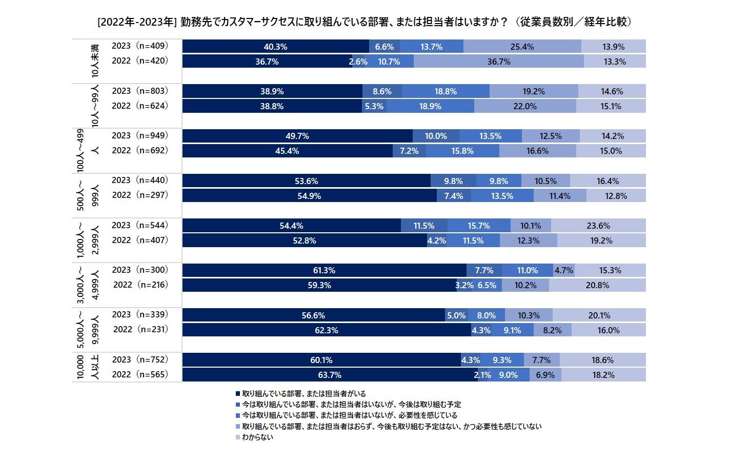この結果を回答者の勤務先従業員規模別に見てみると、「取り組んでいる部署、または担当者がいる」と回答した割合について、10人未満規模の企業では昨年より3.6ポイント上昇し40.3%、これは2019年初回調査時の7.9%から大きく増加しており、少人数規模でもカスタマーサクセスの取り組みに注力している企業がこの5年で大幅に増えたことがよくわかります。その他10人~99人規模、100人~499人規模、3,000人~4,999人規模でもそれぞれ昨年より取り組んでいる企業が増えています。