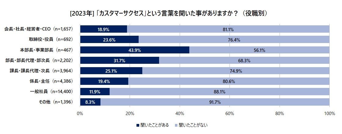 まず、役職別でカスタマーサクセスに対する認知および理解を見てみると、企業のトップを務める人たちの実に81.1%が「カスタマーサクセスという言葉を聞いたことがない」という衝撃の結果が示されました。