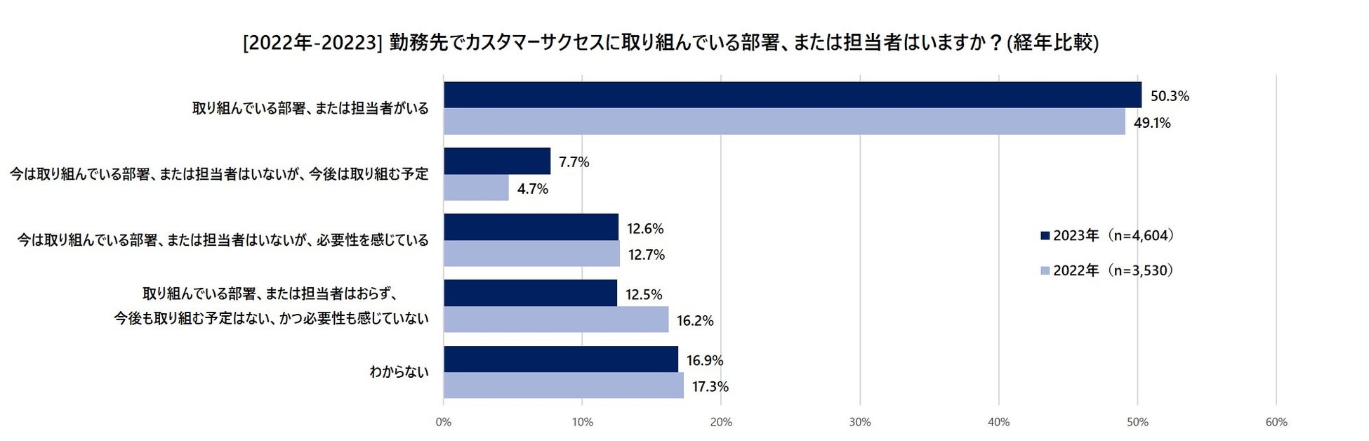では次に、実際の取り組み状況を見ていきます。カスタマーサクセスという言葉を認知している4,604人に対して、「勤務先でカスタマーサクセスに取り組んでいる部署、または担当者がある/いるか」と尋ねたところ、部署がある/担当者がいると答えた人は50.3%と、昨年からわずかな伸びであるものの、過去5年で初めて半数を超える結果となりました。また取り組みの予定がある人については昨年より増加、「取り組みの必要性を感じていない」と答えた人は、昨年より減少しました。