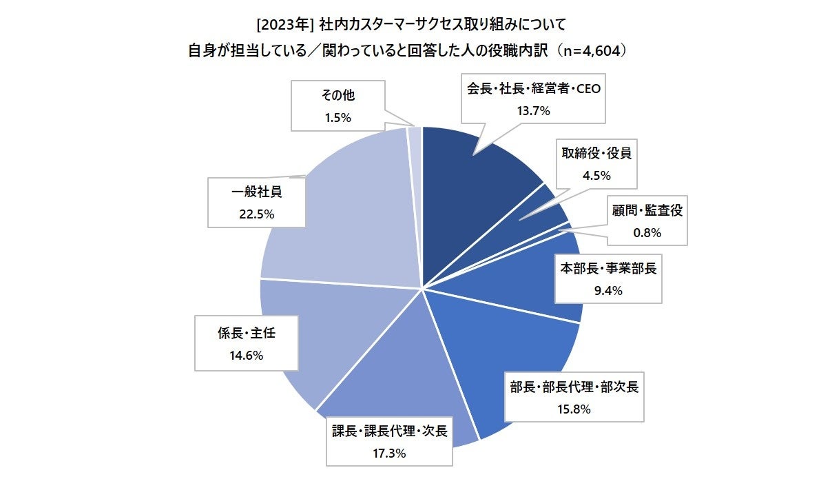 なお、カスタマーサクセスを社内で取り組んでいると答えた人のうち、回答者自身が「カスタマーサクセスを担当している/取り組みに関わっている」という人の役職内訳を見てみると、13.7%の企業トップの人たちが自らカスタマ―サクセスに取り組んでいることがわかりました。全体でも決裁権を持つ役職者の人でカスタマーサクセスに関わっている人は多く、これは昨年と同様の傾向となる結果でした。カスタマーサクセスを重要であると理解している経営層は、自らがその取り組みに注力していることがわかります。