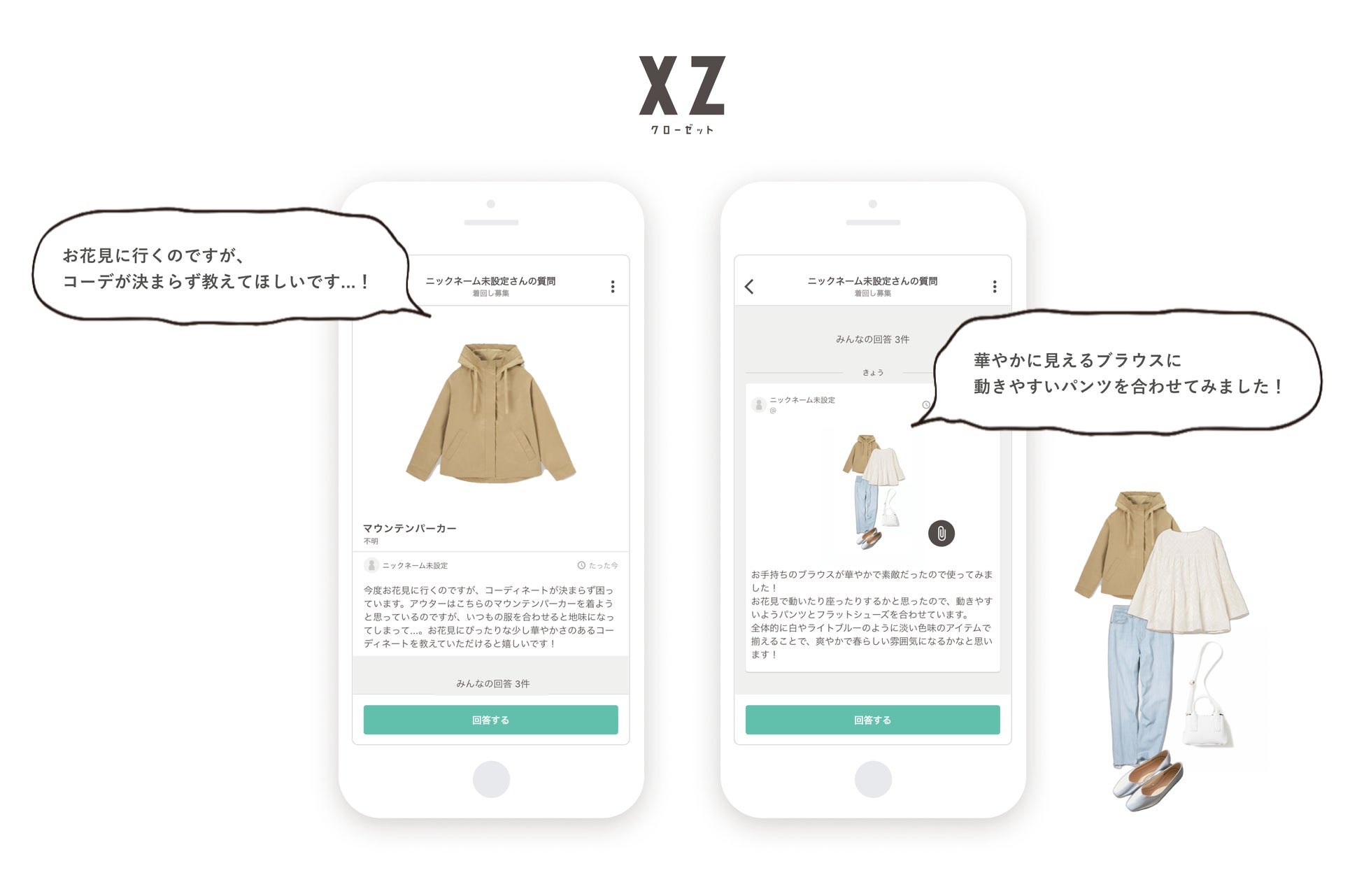 XZでは、アプリを利用しているユーザー同士でコーディネートやお買い物の相談ができる「着こなしQ&A」の機能をご提供しております。自身のクローゼットの中を見てもらいながら相談ができ、実際に持っている服を使ったコーディネートを作成して回答・提案してもらえるので、より実践的なお悩みの解決ができます。