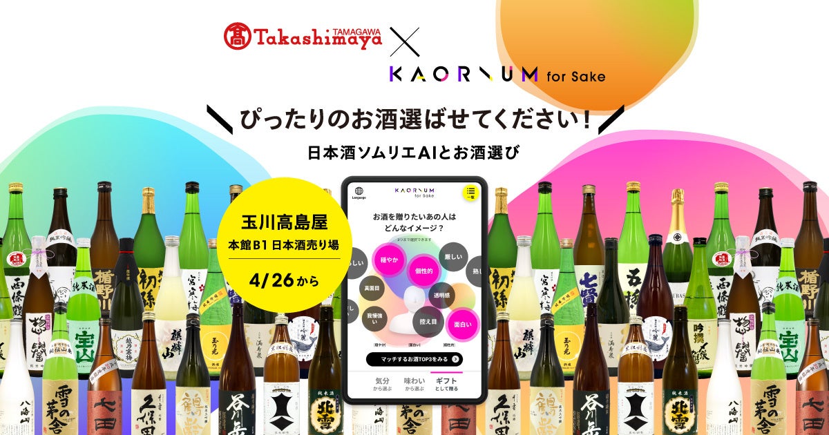 嗅覚のデジタライゼーションによって新たな顧客体験を提案するSCENTMATIC 株式会社(代表取締役:栗栖俊治、本社:東京都、以下「セントマティック」)と 玉川高島屋は、2023年4月26日(水)より玉川高島屋 本館B1にある日本酒売り場に、“なりたい気分”に合わせてお酒を選んだり、“贈りたい相手のイメージ”からからお酒を探せる日本酒ソムリエAI「KAORIUM for Sake」を設置いたします。※KAORIUM はSCENTMATIC 株式会社の登録商標です。