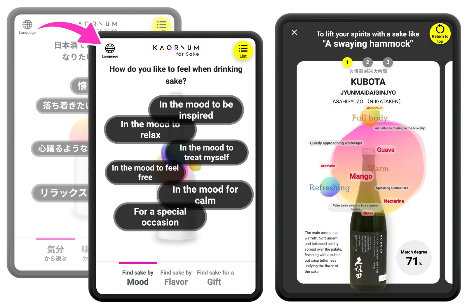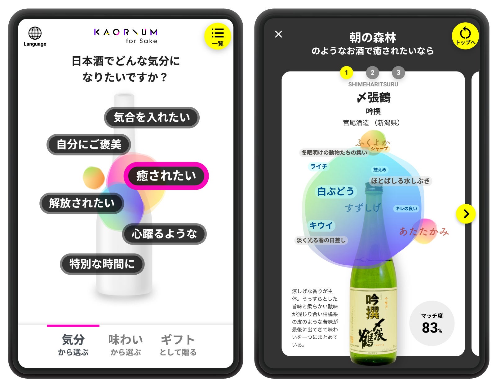 日本酒ソムリエAI「KAORIUM for Sake」は、インターネット上の膨大な言語表現と人の香りの感じ方を学習したAI に、1万以上の日本酒の風味・感性データと酒ソムリエの感性を融合させた最先端のAI システムです。自然言語処理によって、表現の難しい日本酒の風味を、わかりやすい言葉で表したり、ある言葉に紐づく日本酒を導き出することを可能にします。