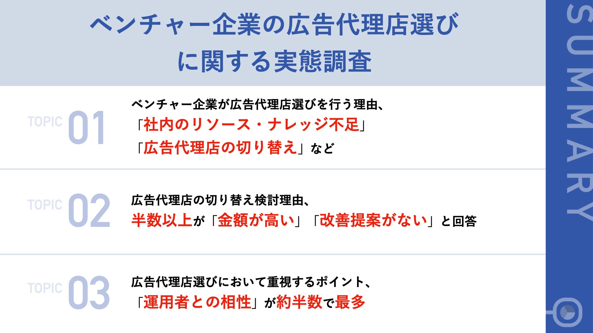 今回の調査では、自社のリソースやナレッジ不足を補うために広告代理店を活用しているものの、ベンチャー企業の担当者が相性の良い広告代理店選びに苦戦している様子が伝わる内容となりました。業界や事業に対して理解のある広告代理店さえ見つかれば、「視座の変化」や「課題解決」に至る提案を受けることができるため、安易にネームバリューや紹介で決定せず、慎重に比較検討する必要があると言えるのではないでしょうか。