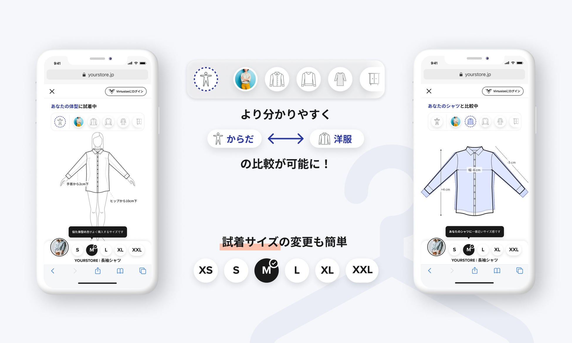 バーチャサイズは、ECサイト上におけるアイテム同士の比較だけでなく、簡単なデータ入力で生成されるユーザーごとにパーソナライズ化されたシルエットとの比較も可能な、既存のサービスとは異なる視点でのサイズ比較ソリューションを提供しています。当社は、ユーザーのサイズの悩みを解決し、安心したオンラインショッピングを提供できるよう、日々アップデートを重ねています。