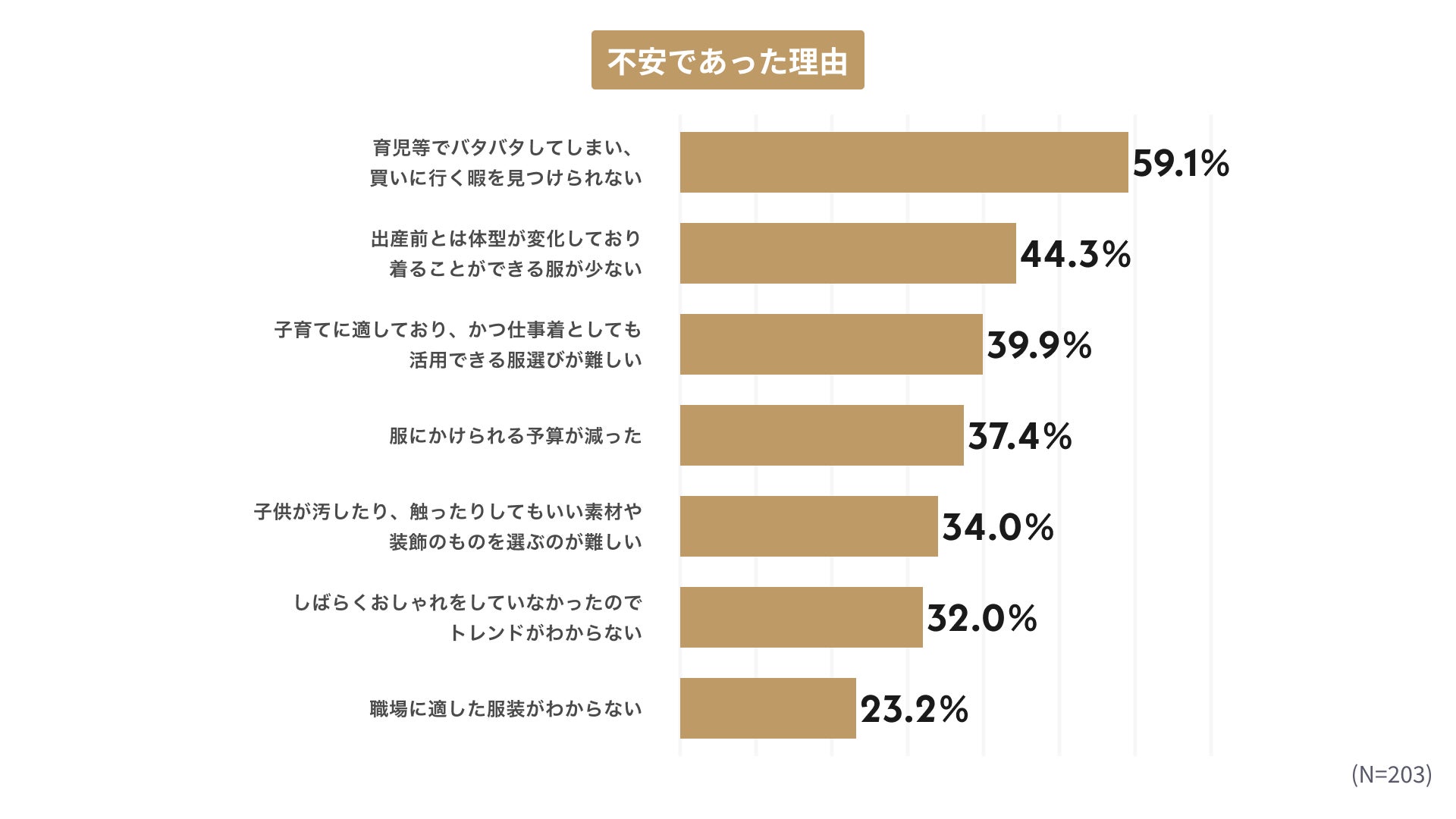 ファッションアイテムの準備に対して不安があったという方が一定数いることが明らかになりましたが、その理由としては「育児等でバタバタしてしまい、買いに行く暇を見つけられない」がTOPになり、「出産前とは体型が変化しており着ることができる服が少ない」が2番目に多い結果になりました。