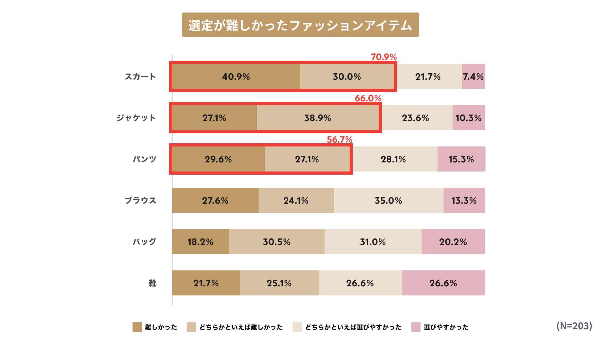 - 選定が難しいアイテムは1位は「スカート」2位は「ジャケット」3位は「パンツ」で