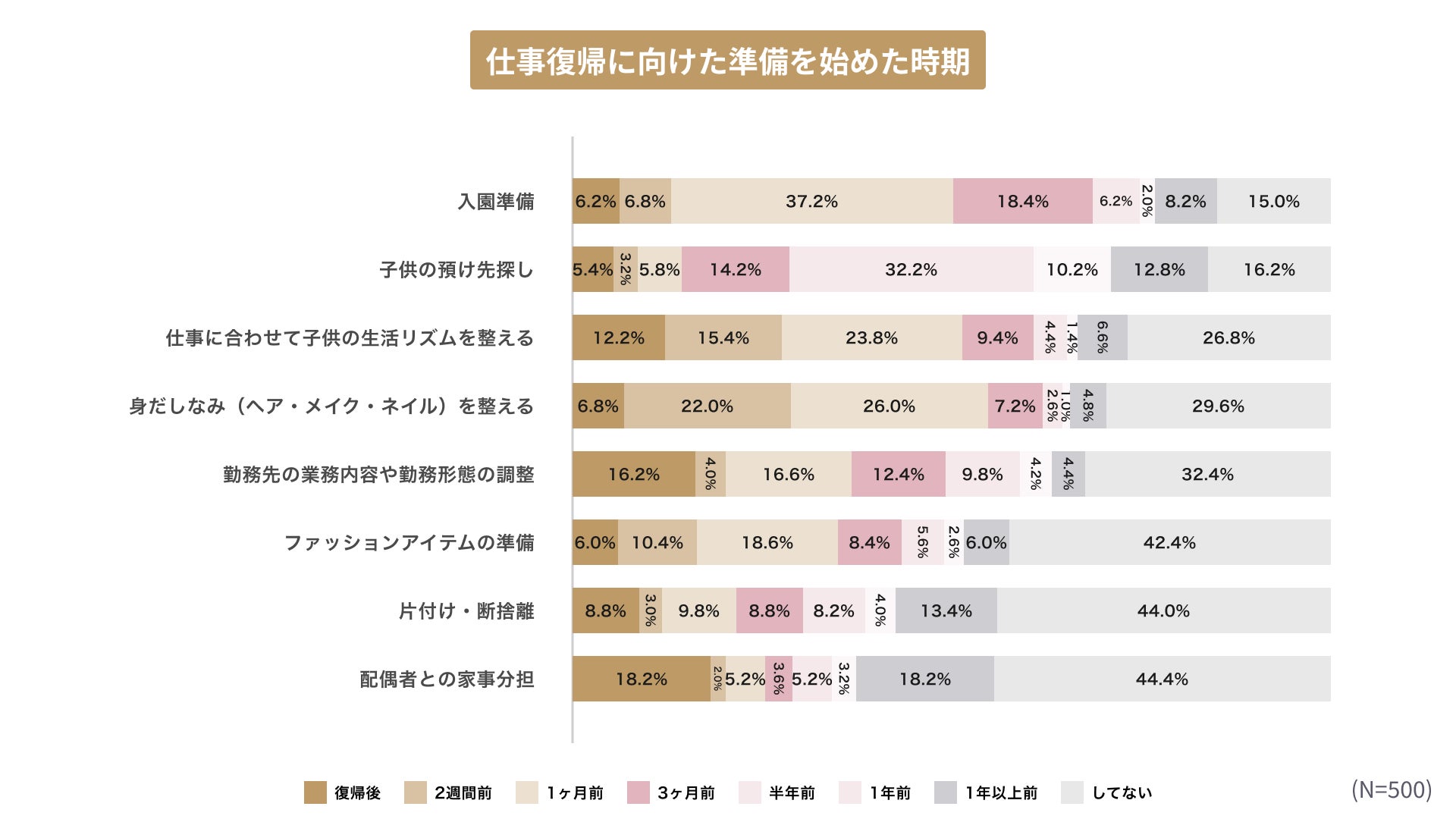​​ 仕事復帰に向けての準備として、入園準備や子供の預け先探し、子供の生活リズムを整えるなど様々ありますが、それらを始めた時期と有無についてお伺いしたところ、子供に直接関連すること以外に、「身だしなみ(ヘア・メイク・ネイル)を整える」ことを実施した人が7割を超え、比較的に早い段階で準備をする方が多いという結果になりました。