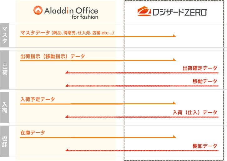 これにより、「アラジンオフィス for fashion」と「ロジザードZERO」間の、各種マスタや、発注~入荷、受注~出荷、在庫におけるデータ連携が自動で可能になります。