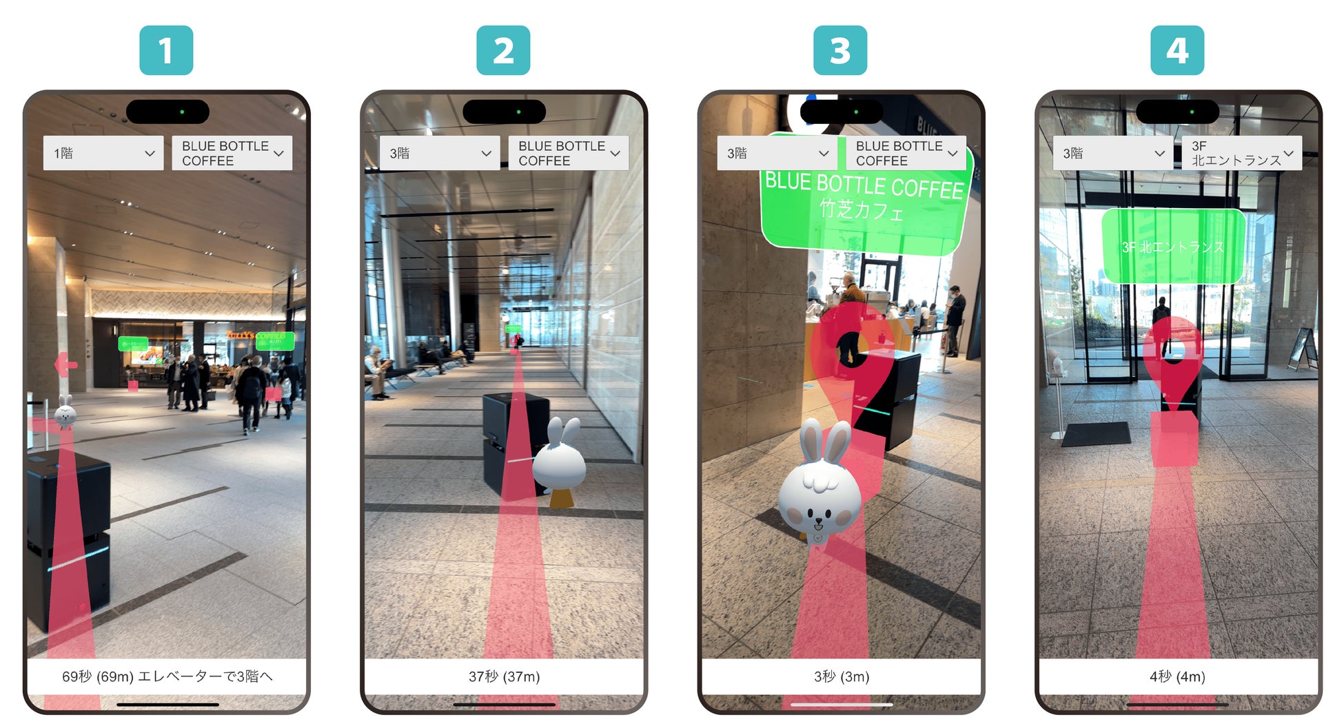 ビーブリッジが、「地図・GIS基盤システム」を通して共有されたデータを活用し、ARナビゲーションアプリで建物内の目的地までのルートや店舗情報などを表示することで、人による配送のサポートを行いました。