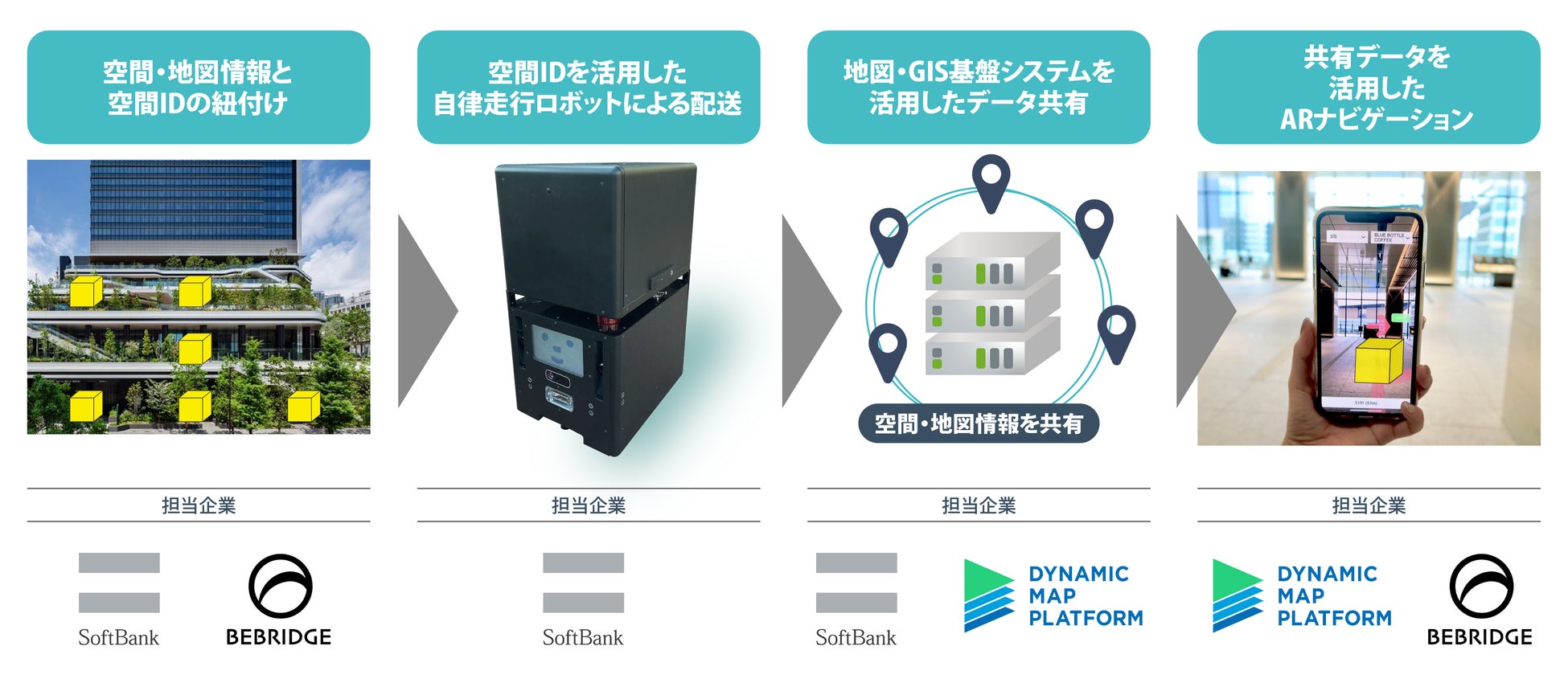 ダイナミックマッププラットフォーム株式会社(代表取締役社長CEO:吉村 修一、以下「ダイナミックマッププラットフォーム」)、ソフトバンク株式会社(代表取締役 社長執行役員 兼 CEO:宮川 潤一、以下「ソフトバンク」)および株式会社ビーブリッジ(代表取締役:野崎 良博、以下「ビーブリッジ」)の3社は、デジタル庁から受託した「デジタルツイン構築に関する調査研究」注1の一環で、空間IDを活用した、配送ロボットとARナビゲーションのデータ共有に関する実証実験を、2023年2月に東京ポートシティ竹芝(東京都港区)で実施しました。