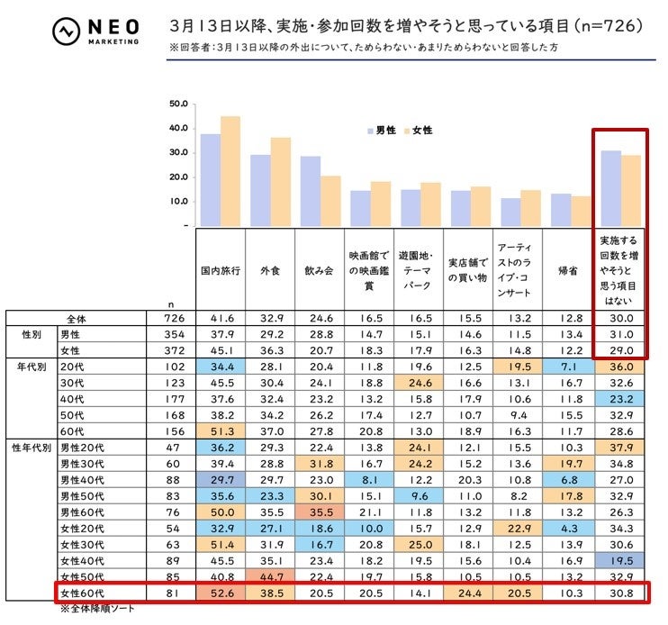 前掲した設問【3月13日以降の「外出」への気持ち】にて「外出することをためらわない」「外出することをあまりためらわない」と回答した方に対し、3月13日以降実施する回数を増やそうと思う項目をお聞きしました。なおスクリーニング設問では、あらかじめ【新型コロナウイルスの影響で、今まで控えていた、または実施する回数を減らしていた項目】を聴取しています。
