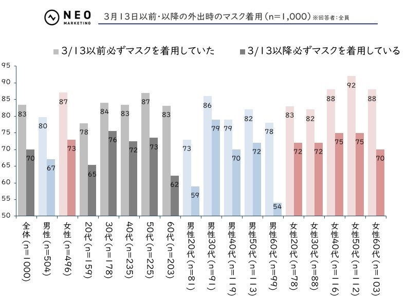 - 3月13日以前・以降の外出時のマスク着用(m=1,000)