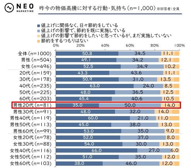 2人程度は値上げの影響で節約への意識を持っており、特に男性の 20 代でその傾向が顕著です。 また、値上げに関係なく節約を心掛けている人が半数にのぼることから、日本人の堅実な生活ぶりが垣間見れます