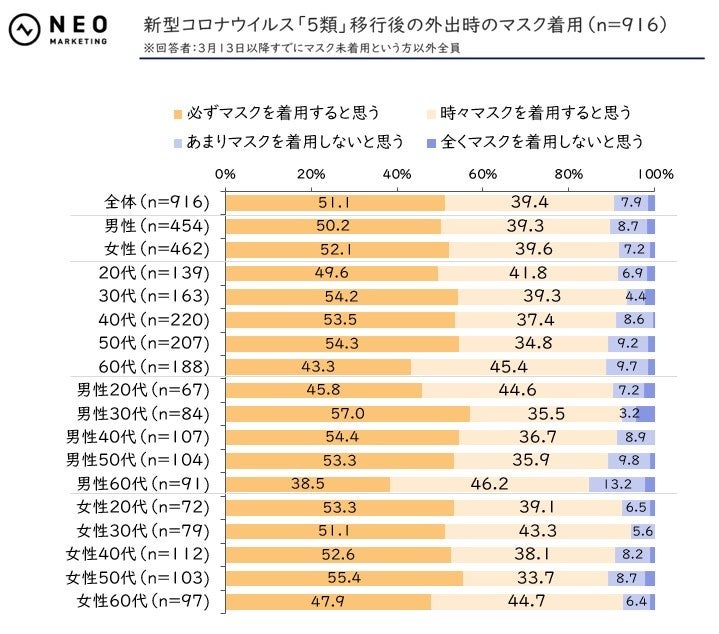 - 新型コロナウイルス「5類」移行後の外出時のマスク着用(n=916)