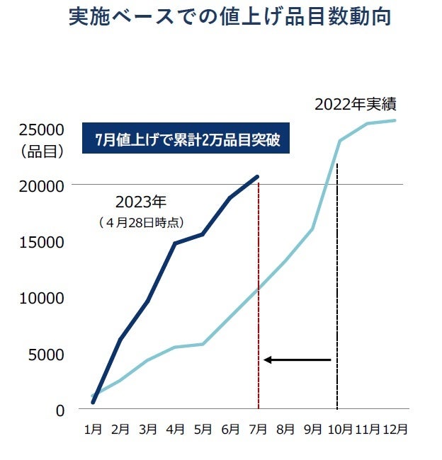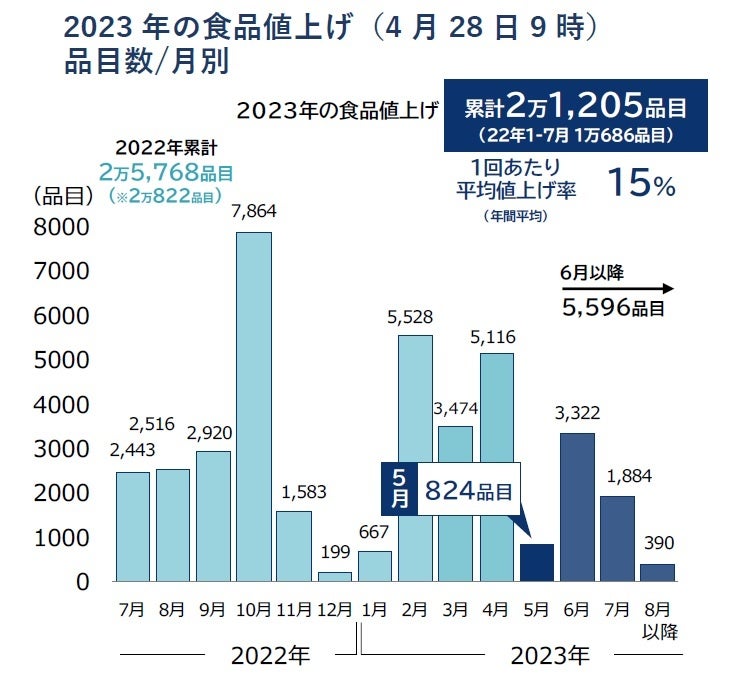 5月の値上げも前年を超えるハイペースが続く。2023年における家庭用を中心とした飲食料品の値上げ品目数は、4月28日までの判明ベースで累計2万1205品目に上った。また、今年1-7月までに値上げ済み・または値上げが予定される食品の累計品目数(2万815品目)は、前年と同じ時期(22年1-7月:1万686品目)に比べ約2倍に上った。