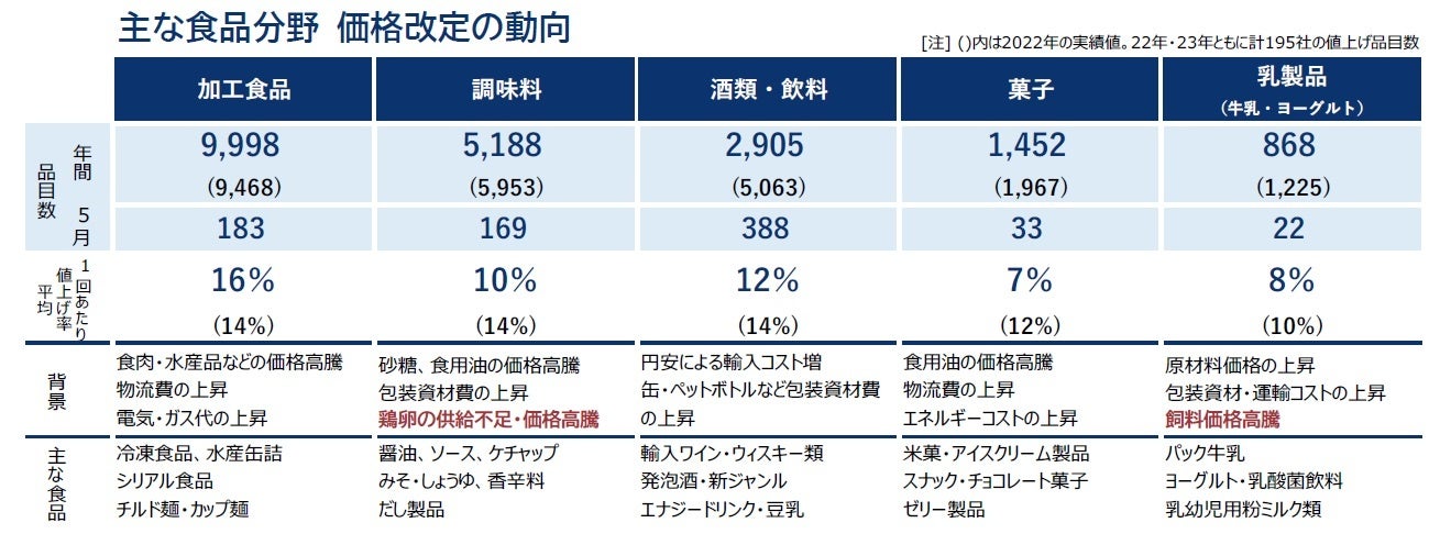 2023年の値上げは前年に比べ、コスト増加分を価格へ転嫁する姿勢が目立つ。加えて、人件費や電気・ガス代の上昇など新たなコストアップも表面化し、幅広い分野で値上げが相次ぐ要因となっている。一部の製品では原材料価格の落ち着きなどを理由に価格据え置きや値下げに踏み切ったケースもあるものの、多くの食品では物流費など値上げ要因に対して解消のメドが立っておらず、少なくとも今秋まで断続的な値上げの動きが続くとみられる。