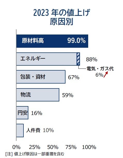 2023年に予定される値上げ2万品目のうち、原材料高が理由となったものは99%(品目数ベース)と、ほぼ全てで原材料高が理由にあげられた。また、足元では電気・ガス代上昇に伴う値上げの割合が6%(3月末:5%)に拡大し、エネルギー価格高騰による影響が広がった。