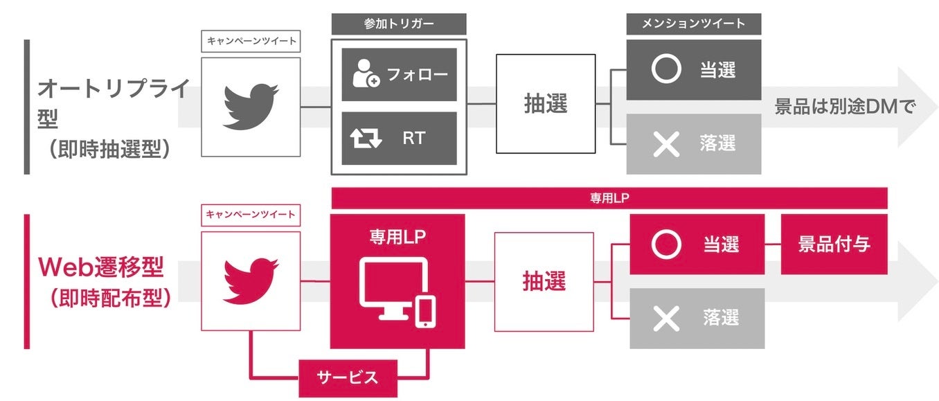 また、当落結果の表示がTwitter上で行われるオートリプライ型とは異なり、サービスのWebページ内、アプリのお知らせ内などに当落結果を表示することができます。同仕様により、サービス、アプリのKPIへの貢献が可能です。