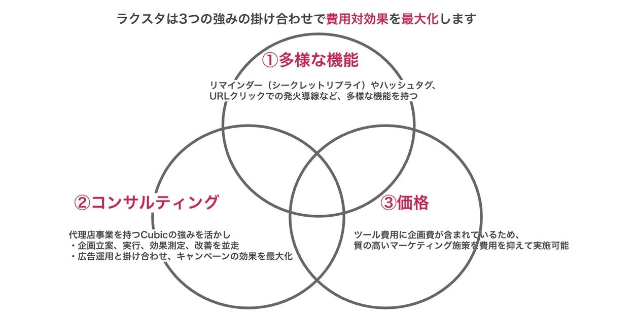 「ラクスタ」は3つの強みの掛け合わせでマーケティングの費用対効果を最大化します。
