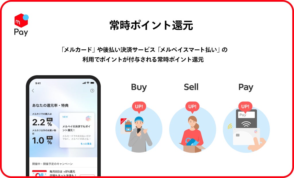 特に還元率は、「メルカリ」の利用実績等によって変化するため、購入や支払いだけが対象ではなく、売っても、買っても、お店で支払っても変化していきます。「メルカリ」を利用いただいている多くのお客さまが体験されている売る、買う、支払うの3つのアクションを還元率上昇のきっかけとすることで、普段通り「メルカリ」を使っていただくだけで、還元率のことを特別に意識することなくお得になっていきます。