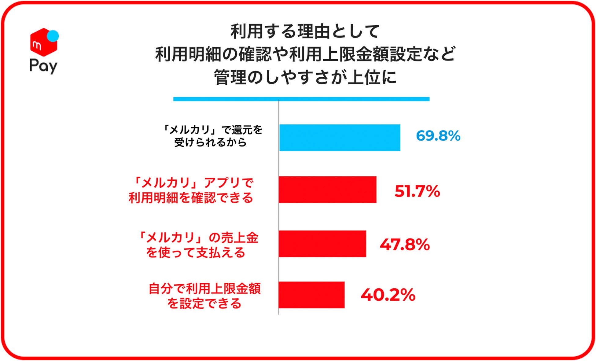 また、実際に「メルカード」を利用しているお客さまに「メルカード」を利用する理由を聞いたところ、「メルカリアプリで利用明細を確認できる(51.7%)」や「メルカリの売上金を使って支払える(47.8%)」といった「管理のしやすさ」に関する項目が多く挙がりました(※5)。