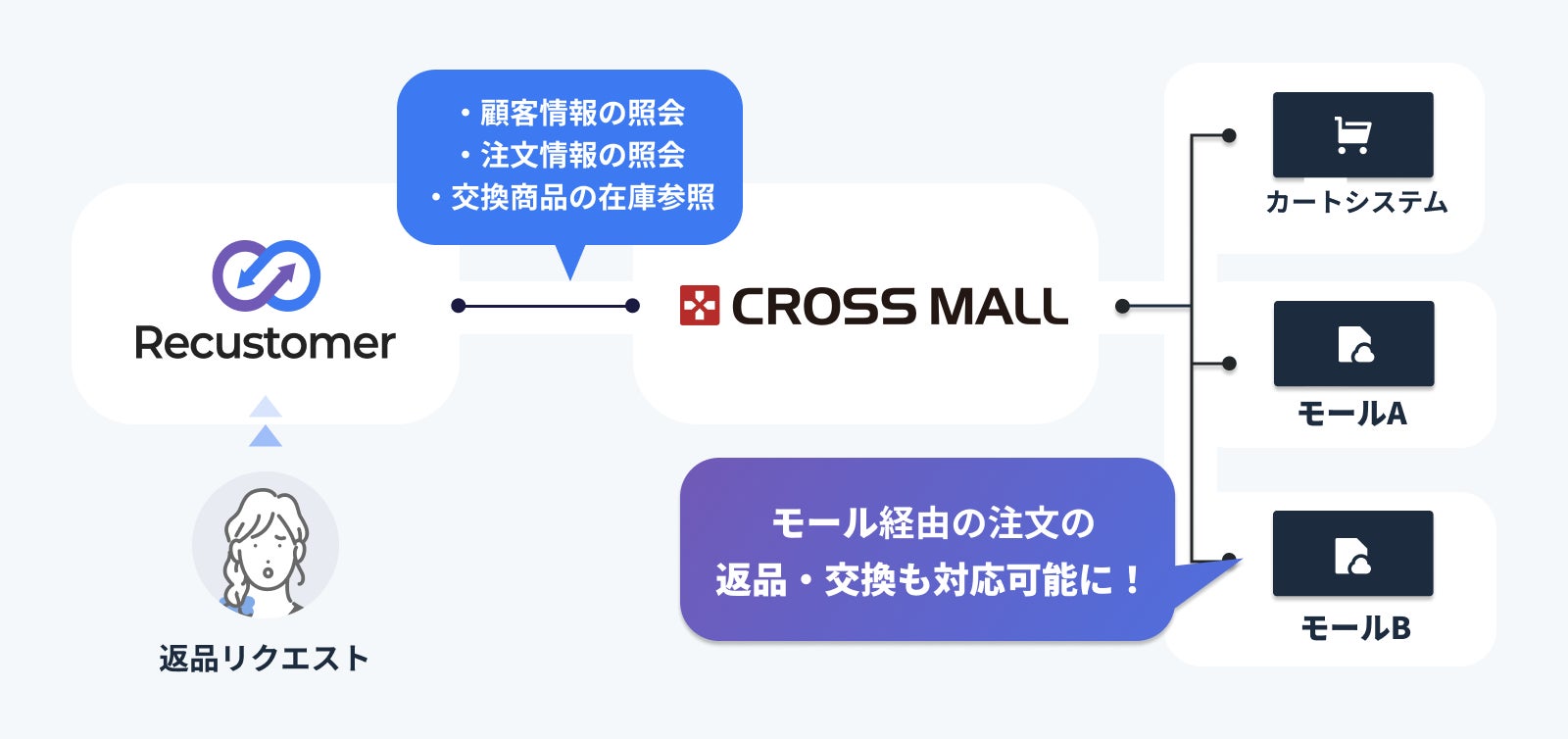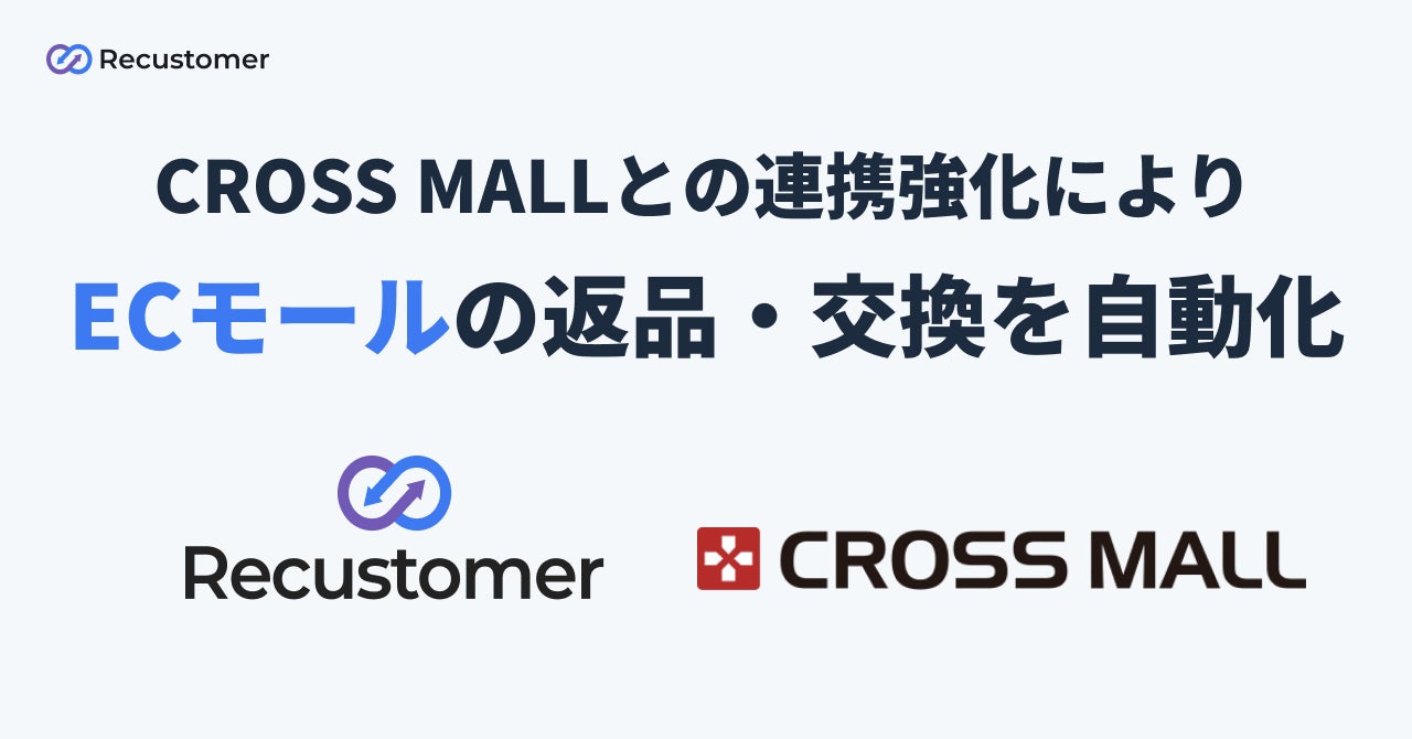 購入体験プラットフォーム「Recustomer(リカスタマー)」を運営するRecustomer株式会社(本社:東京都千代田区、代表取締役:柴田 康弘)は、株式会社アイル(本社:大阪市北区・東京都港区、代表取締役社長:岩本哲夫、証券コード:3854)が提供する複数ネットショップ一元管理クラウドサービス「CROSS MALL(クロスモール)」との連携を強化いたしました。これにより、自社ECだけでなく、モール系EC経由の注文の返品・交換作業も自動化可能になりました。