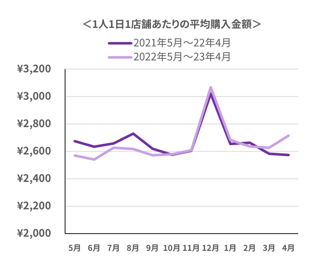 2023年4月の平均購入金額は、前年同月比で約5.4%(+140円)増加し、減少傾向にあった2月から一転、3月に続いて平均購入金額が大幅に増加した形となりました。この増加傾向は、平均単価が約4.1%(約+8.8円)増加、平均購入数量は約1.3%(約+0.2点)増加したことが要因となっており、平均単価だけではなく購入数量の大幅な増加も大きく影響していることが見て取れます。(下記グラフ参照)