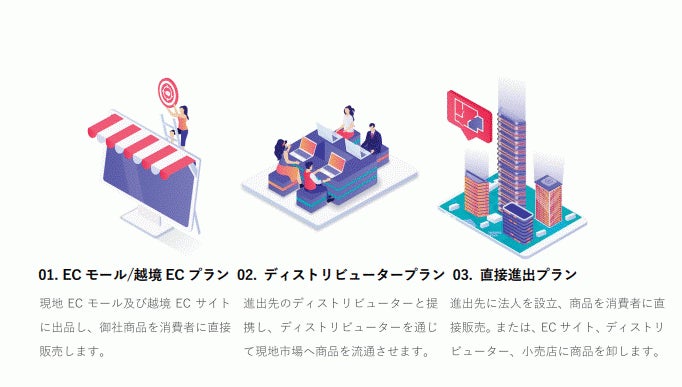 サービスプランはお客様の進出戦略に応じて、①ECモール・越境ECプラン、②ディストリビュータープラン、③直接進出プランの3タイプを提供いたします。なお、進出に関する相談は無料でご対応しております。
