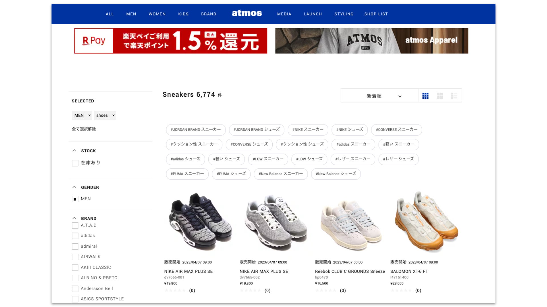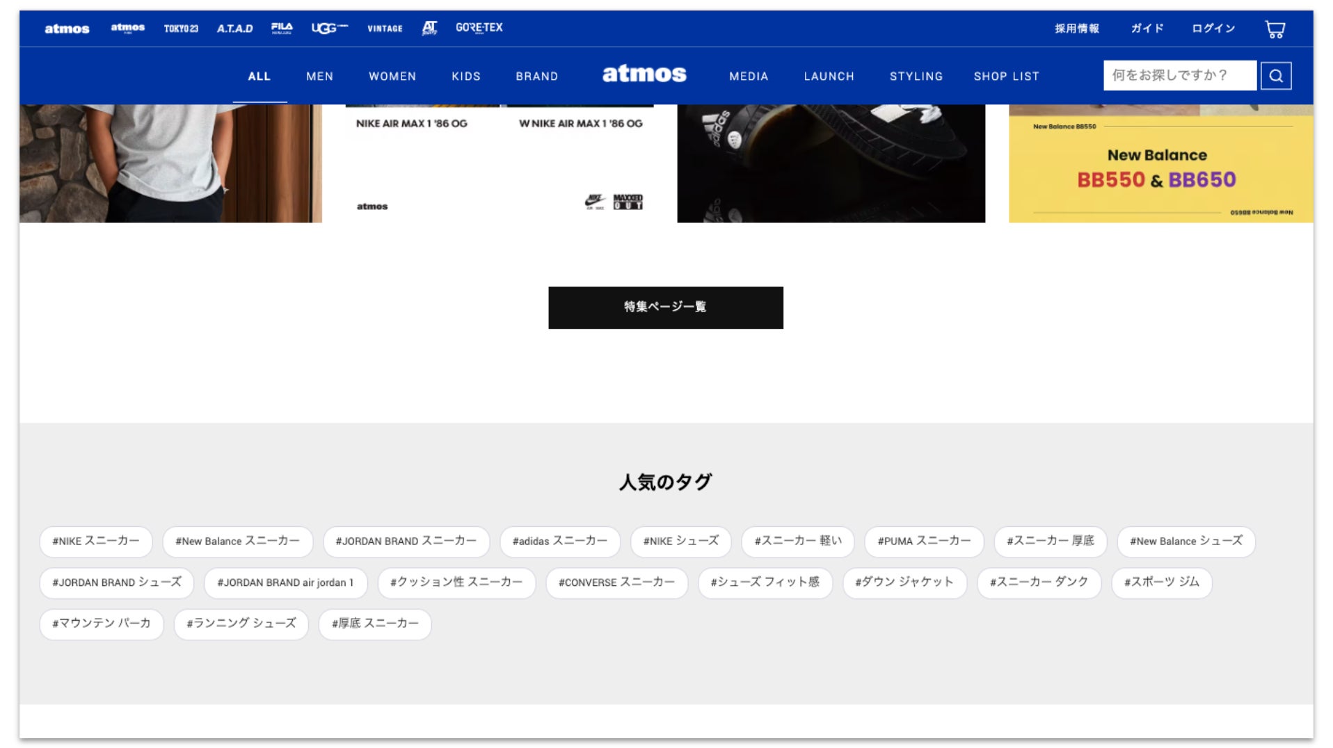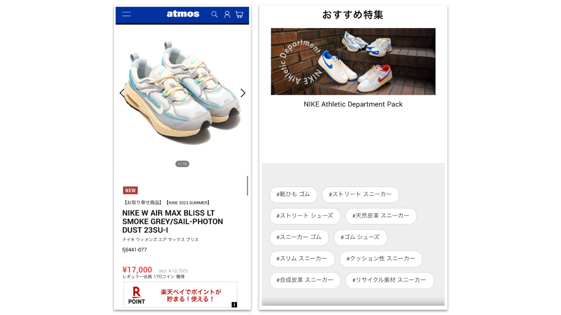 atmos(アトモス)では、サイトのTOPページ、商品カテゴリーページ、商品詳細ページに『awoo AI』が自動生成したハッシュタグを表示させ、ツール導入初月より、サイト回遊率を3.4倍、CV率を1.6倍に改善しました*。また今後は「atmos 公式アプリ」にもハッシュタグを実装し、オンラインショッピングのさらなる利便性を高めていく狙いです。
