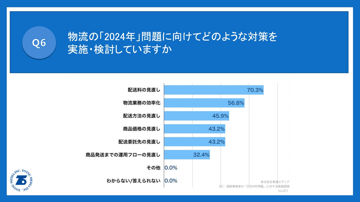 Q5で「実施している」「検討している」と回答した方に、「Q6.物流の「2024年」問題に向けてどのような対策を実施・検討していますか。(複数回答)」(n=37)と質問したところ、「配送料の見直し」が70.3%、「物流業務の効率化」が56.8%、「配送方法の見直し」が45.9%という回答となりました。