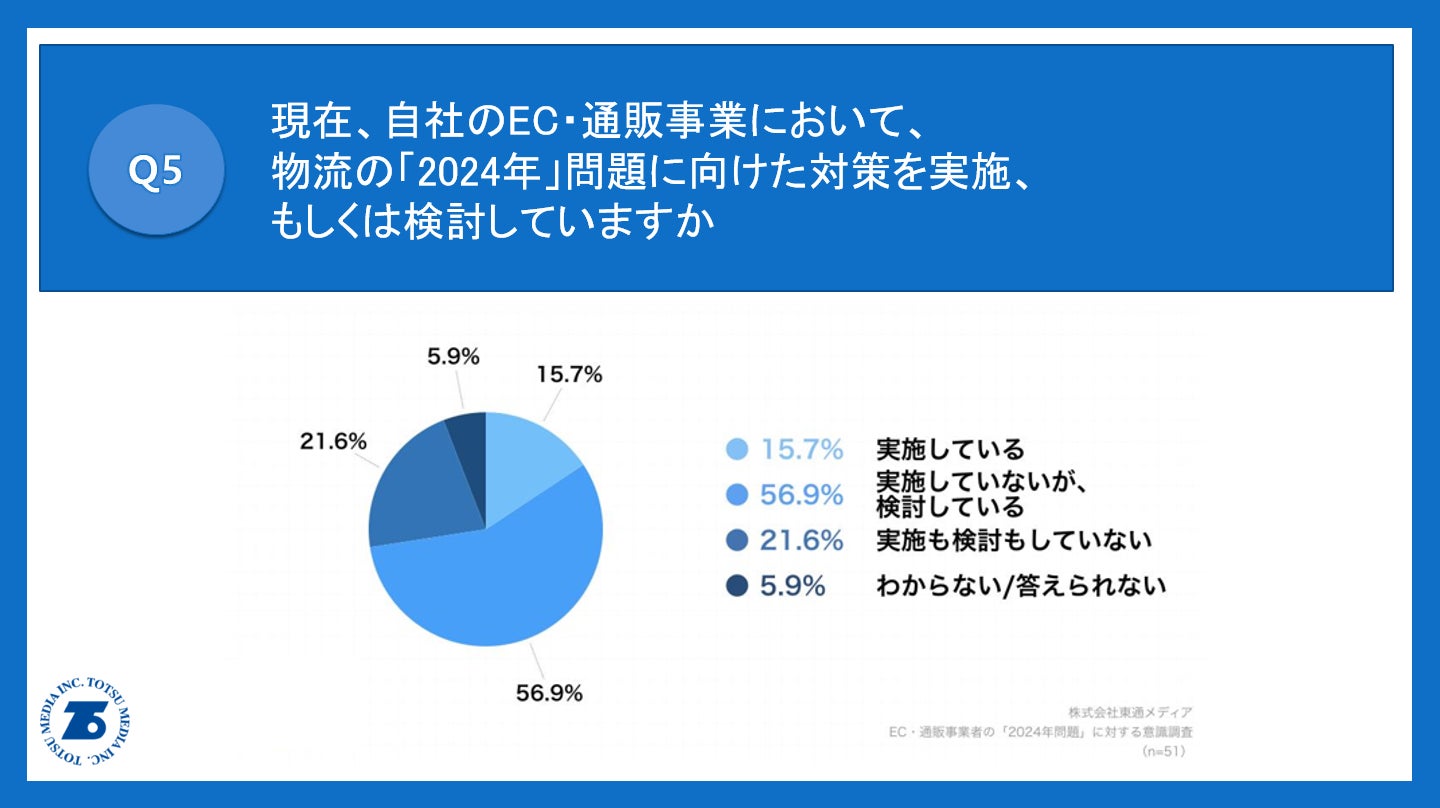 Q2で「非常に感じている」「やや感じている」と回答した方に、「Q5.現在、自社のEC・通販事業において、物流の「2024年」問題に向けた対策を実施、もしくは検討していますか。」(n=51)と質問したところ、「実施している」が15.7%、「実施していないが、検討している」が56.9%という回答となりました。