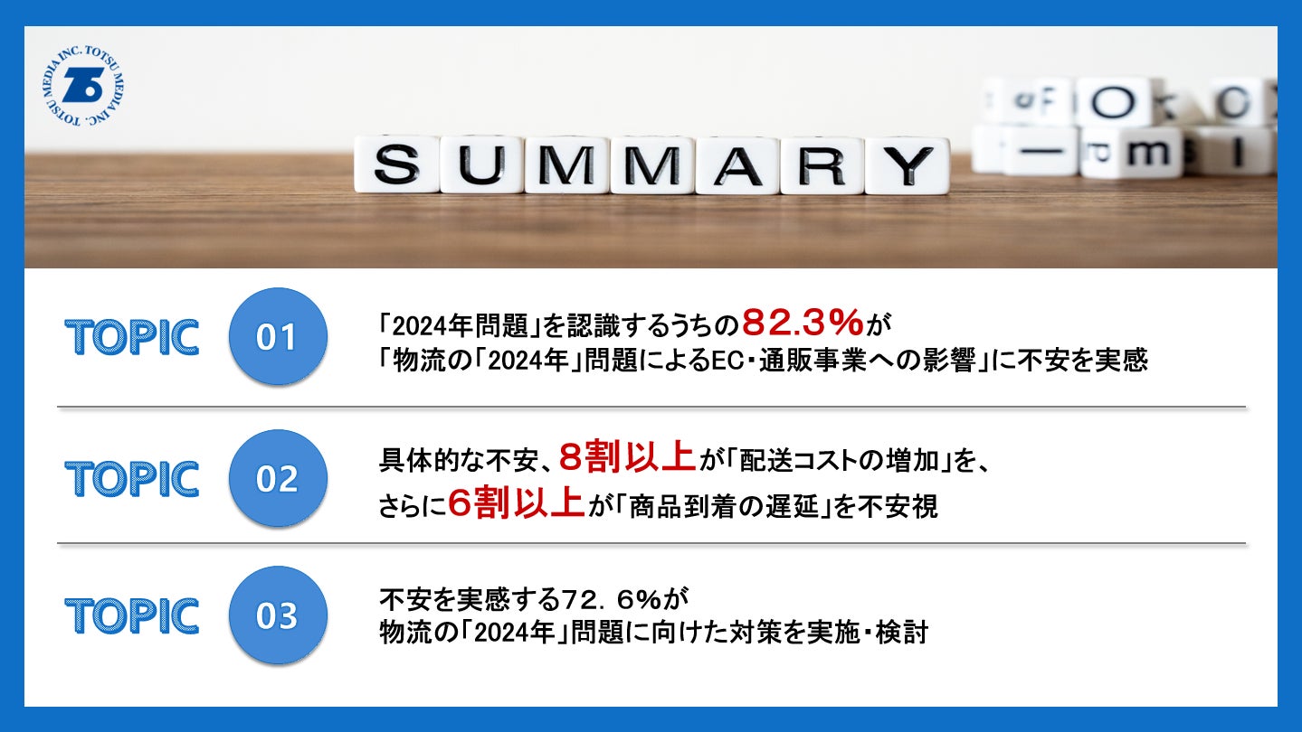 株式会社東通メディア(本社:東京都中央区、代表取締役社長:赤池文孝)は、通販の課題解決・売上達成をサポートする「通販ドクター)」(https://www.totsumedia.co.jp/lp/tsuhandoctor/)を提供しています。通販システム開発やコールセンター運営、メディアプランニング、クリエイティブ制作等も行う東通メディアは、今回、EC・通販事業者(経営者・役員)105名を対象に、EC・通販事業者の「2024年問題」に対する意識調査を実施いたしましたので、お知らせいたします。