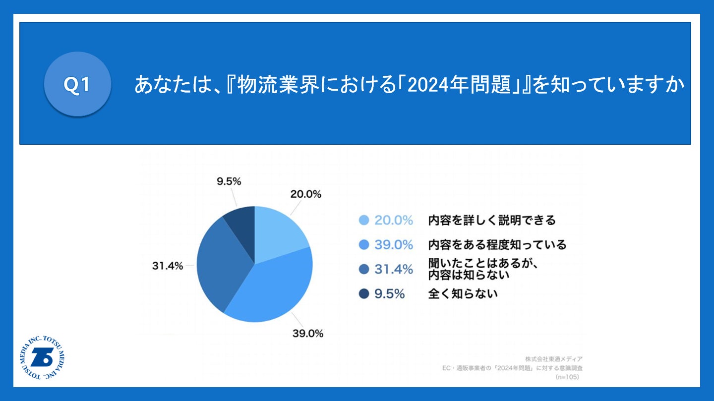 「Q1.あなたは、『物流業界における「2024年問題」』を知っていますか。」(n=105)と質問したところ、「内容を詳しく説明できる」が20.0%、「内容をある程度知っている」が39.0%という回答となりました。