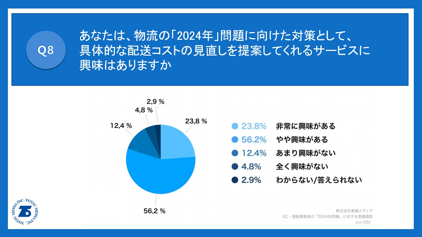 「Q8.あなたは、物流の「2024年」問題に向けた対策として、具体的な配送コストの見直しを提案してくれるサービスに興味はありますか。」(n=105)と質問したところ、「非常に興味がある」が23.8%、「やや興味がある」が56.2%という回答となりました。