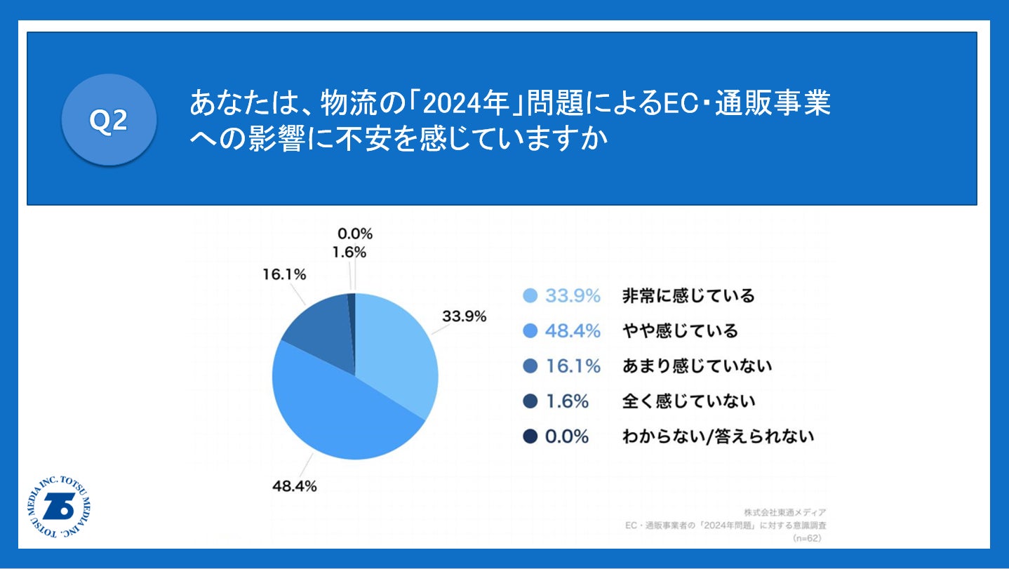 「Q2.あなたは、物流の「2024年」問題によるEC・通販事業への影響に不安を感じていますか。」(n=62)と質問したところ、「非常に感じている」が33.9%、「やや感じている」が48.4%という回答となりました。