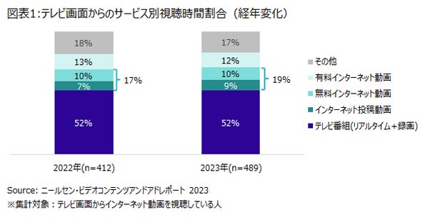 「ニールセン・ビデオコンテンツ アンド アドレポート 2023(Nielsen Video Contents & Ads Report 2023)」によると、テレビ画面からインターネット動画を視聴する人のサービス別視聴時間割合を経年比較すると、インターネット投稿動画と無料インターネット動画を合計した広告型インターネット動画の視聴時間割合が今年は19%で、昨年の17%と比較し2ポイント増加していました(図表1)。