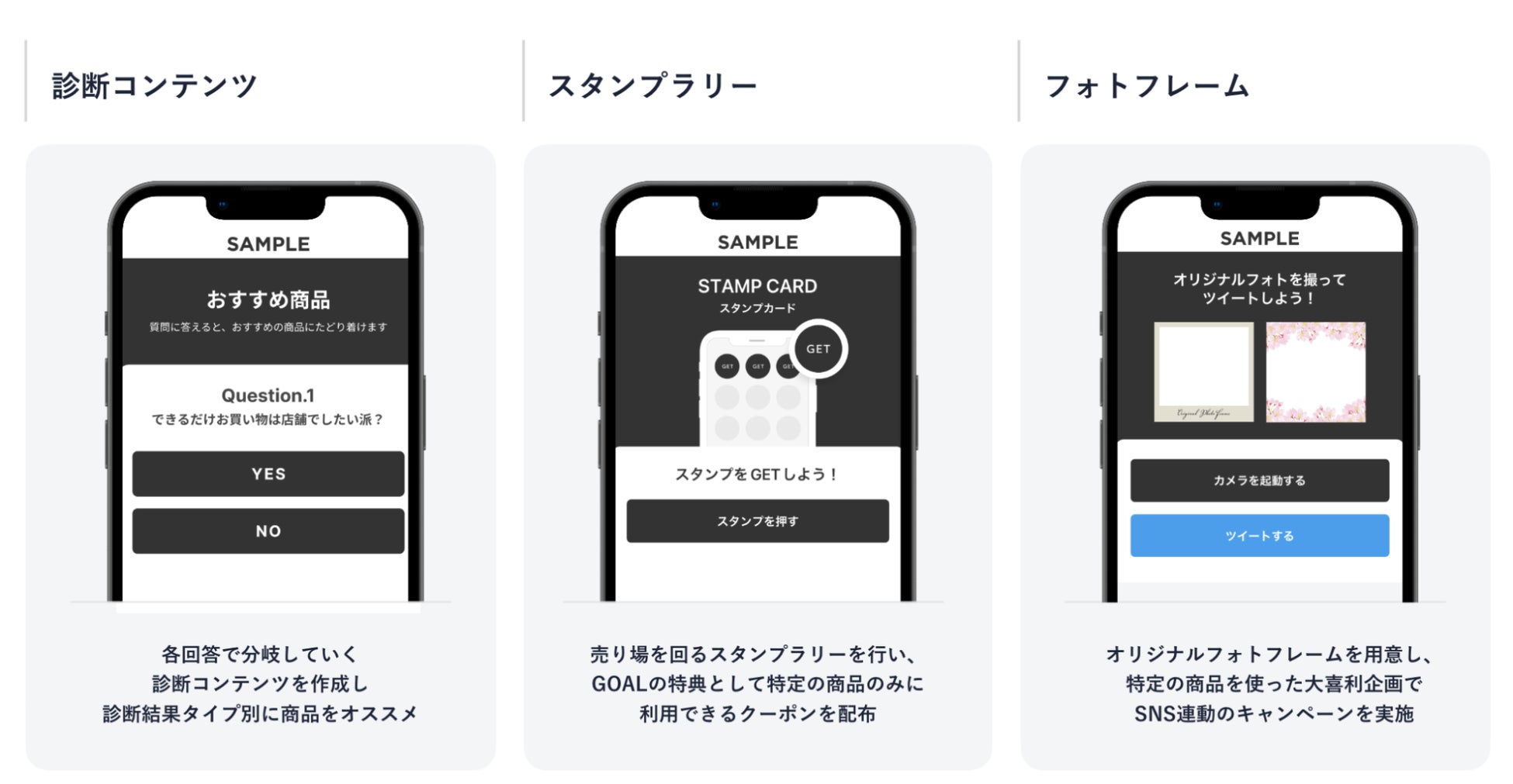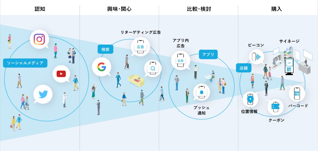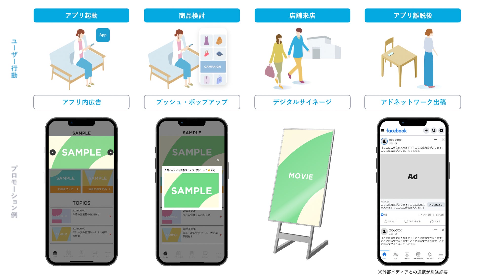 Yappliの強みである「アプリ内での接触」以降のフェーズにおいても、店頭に配置したデジタルサイネージやSNSなどでリターゲティング広告の配信を行うなど、様々な方法でユーザーと接点を持つことが可能なため、各フェーズのユーザー行動に沿った適切なプロモーションを実現します。