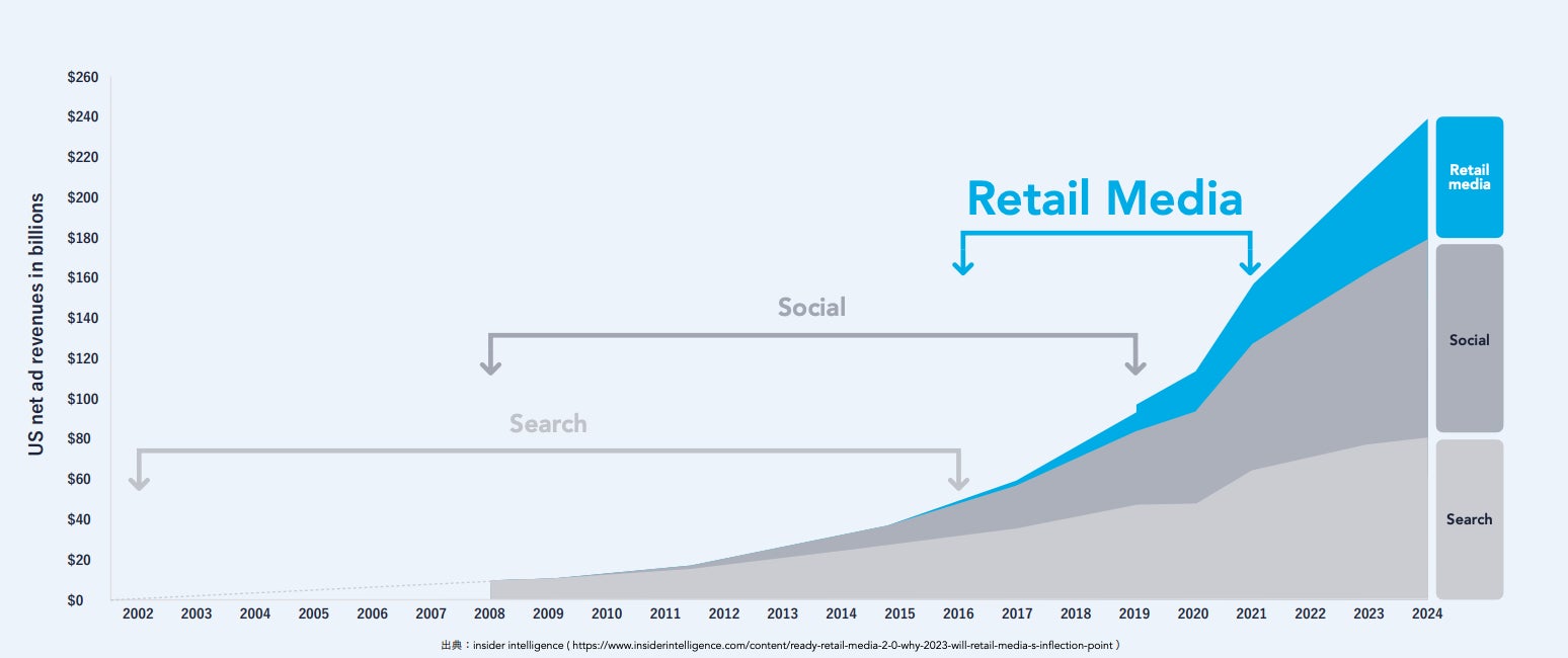 ※引用元:insider intelligenceより(https://www.insiderintelligence.com/content/ready-retail-media-2-0-why-2023-will-retail-media-s-inflection-point)
