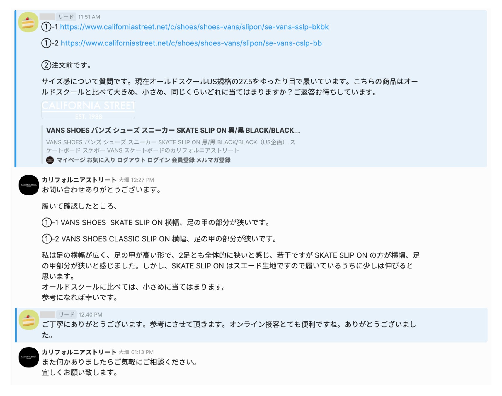 ▲実際のチャット接客の様子(メジャーでの採寸様子を伝える)