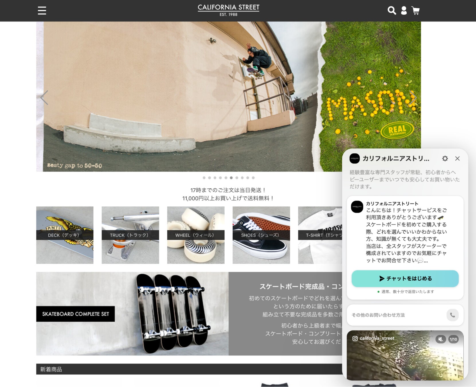 カリフォルニアストリートがメインで扱っているスケートボードは、サイズや組み合わせによって滑り方・スピードが変わってくることから、商品情報を吟味し、慎重に選ばれる方が多く、実店舗と比べてECサイトでの購入ハードルが高い状況でした。そこで、実店舗のようにスタッフに気軽に質問したり、購入前の悩み・疑問を解消しやすくすることで、購入ハードルを下げ、ECでの売り上げを拡大することを目指し、接客チャットツールであるチャネルトークを導入しました。