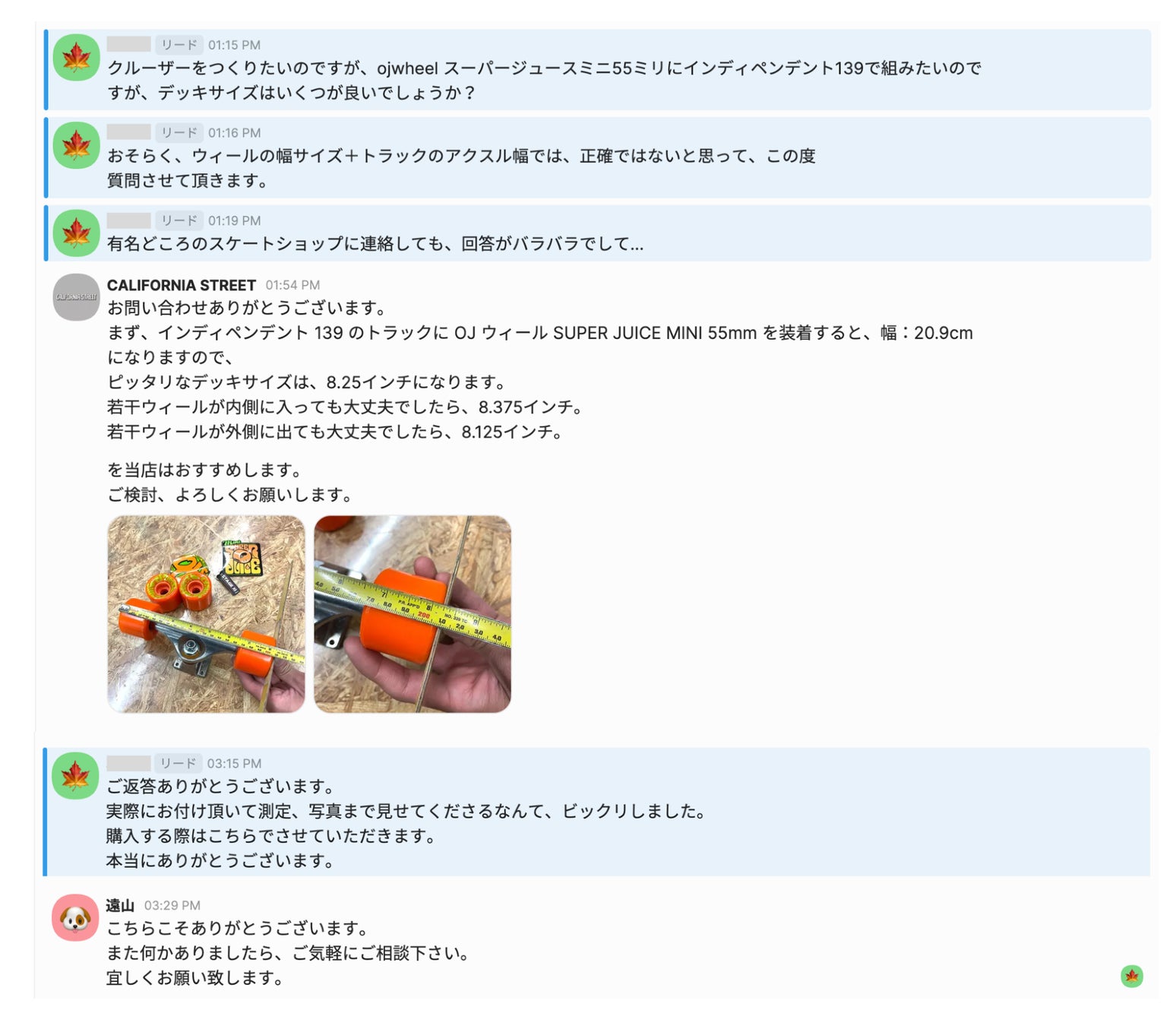 ECサイトでもサイズや材質が手にとるようにわかるように、製品を熟知した専門スタッフが、商品をメジャーで採寸した様子や、部品を組み合わせて実際の活用がイメージできるような写真を送ったり、スタッフが実際試し履きした体感をお伝えしながら、細やかな対応を行っています。チャット接客を行う全員がスケーターであることから、商品選びの不安に寄り添うことで、お客さまに納得・安心して購入いただけるようになり、ご好評頂いています。