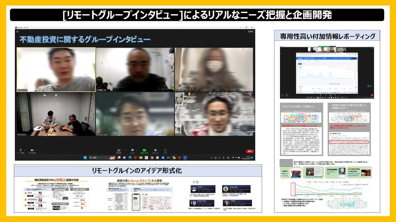 「まず訪日意向の中国人の生の声を聞きませんか?」プロモーション実行やサービス開発の前に中国人のリアルな意見を聞くことでその精度を高めるとともに大きなヒントがもらえるはずです。外部への業務委託で任せきりではなく自らがニーズを把握することが重要です。現地調査会社との提携により300万人の会員からセグメントして、オンラインでのフォーカスグループインタビューも短期間で実施可能です。